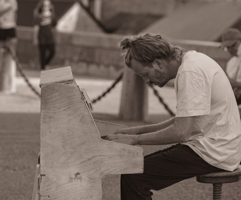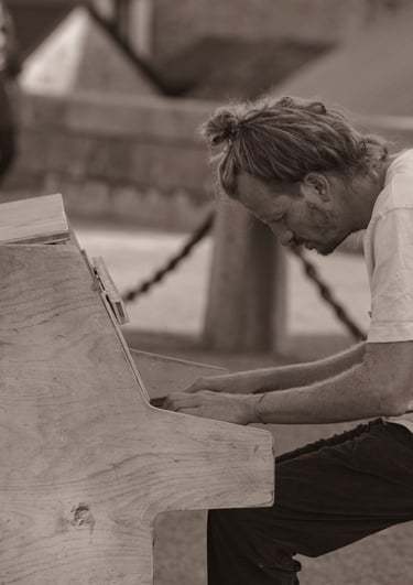Il est fréquent de croiser Björn et son piano acoustique de 6 octaves en extérieur face à un paysage bucolique en création d’un tableau vivant et sonore.
